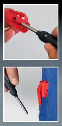 - Försedd med bältesclips för att kunna bäras i bälte, förvaring i byxa eller verktygsficka.