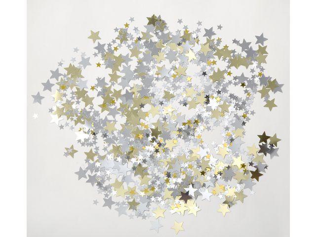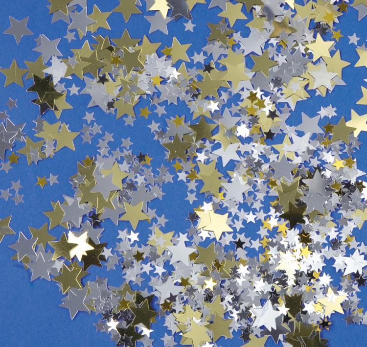 Stjärnpaljetter i guld och silver i flera olika storlekar. Använd paljetterna för pyssel eller dekoration - klistra på vykort, paket, teckningar eller dekorera bord vid festligheter.