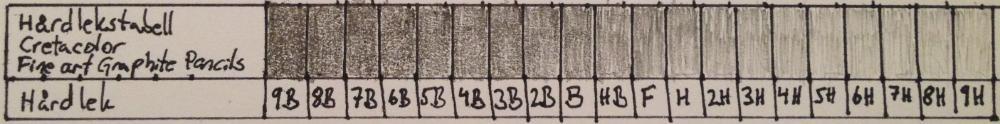 - Följande hårdhetsgrader finns det 1 st penna av: 9B, 8B, 7B, 6B, 5B, 4B, 3B, F, 2H, 3H, 4H, 5H, 6H, 7H, 8H och 9H