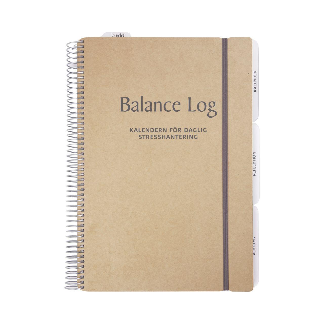 Kalenderbaserat hjälpmedel för daglig stresshantering. Innehåller 6 månaders odaterat kalendarium, månadsöversikt, sidor med verktyg och sidor för reflektion samt mycket mer relevant material. Utvecklad av professionella stresscoacher för att hjälpa dig till en vardag med mer balans och mindre stress. Balance Log är den första i sitt slag, en ban- och vanebrytande kalender, som kan vara ett utmärkt verktyg för många människor. Omslag i naturfärgad ekokartong och gummiband. Plastfickor och flyttbara flikar. Spiralbunden. FSC.