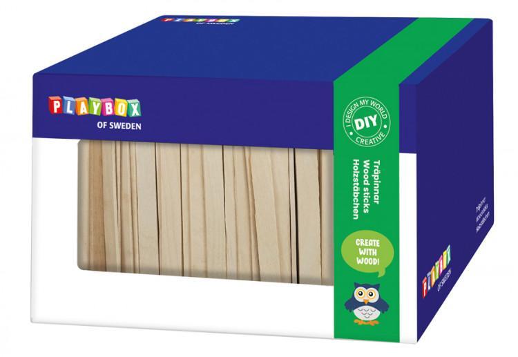 Träpinnar i form av glasspinnar som kan målas och användas till att bygga små hus eller figurer eller varför inte göra ett eget pussel med träpinnar.