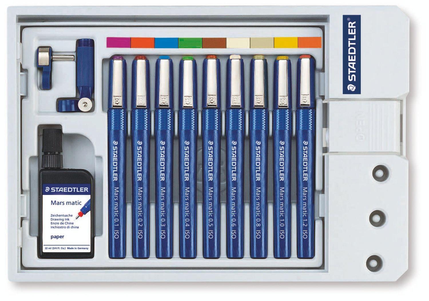 Set med Staedtler Mars Matic 700 tuschritpennor och tillbehör.